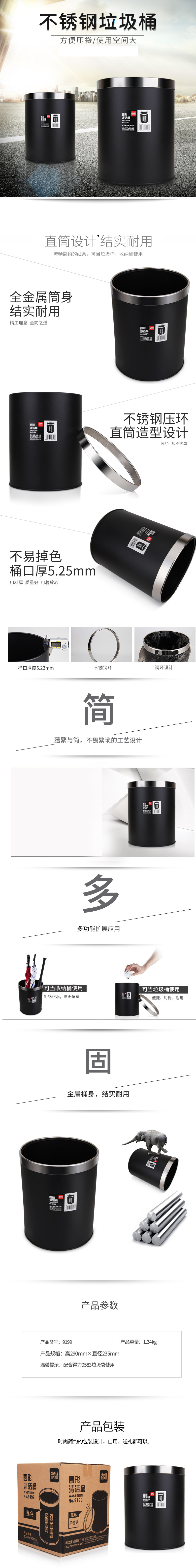 商品名称:得力 圆形压圈 不锈钢垃圾桶 黑色 9199