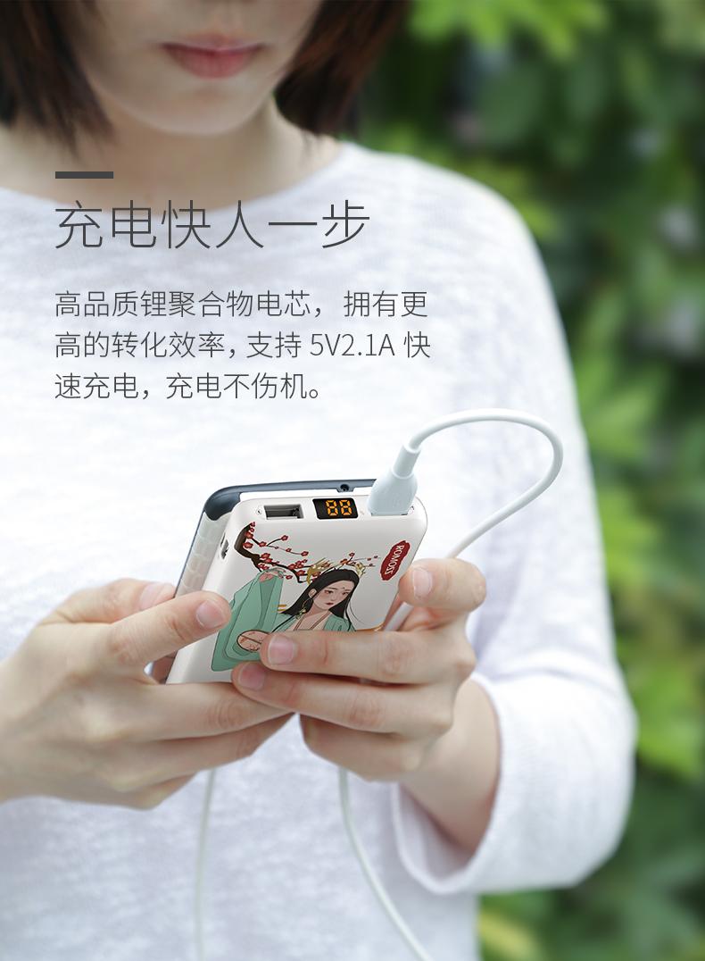 汉服女孩看到这个真的是爱了。到手后先把宝贝充满电了,用宝贝给手机充电两个小时冲了百分之七十左右,充电宝还有60的电,短途旅行可以,长途的话,还是要考虑一下哦