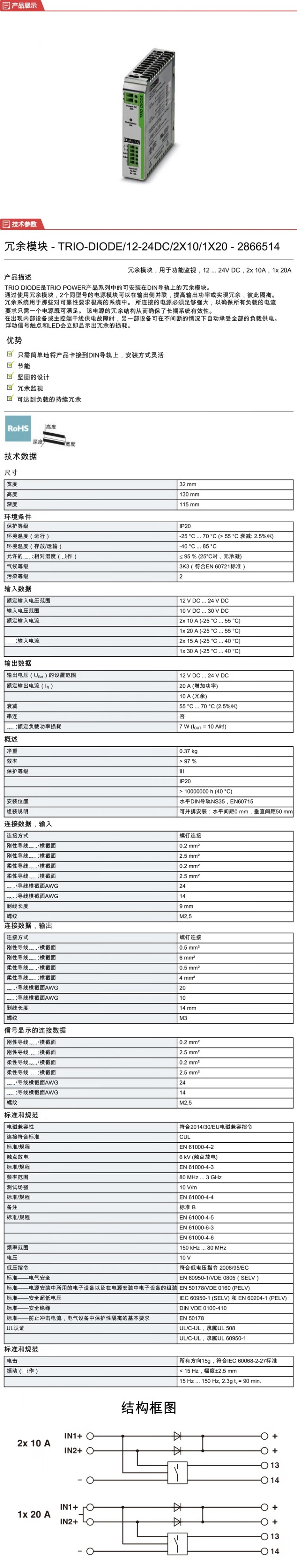 商品名称:菲尼克斯 PHOENIX CONTACT 电源 TRIO-DIODE/12-24DC/2X10/1X20