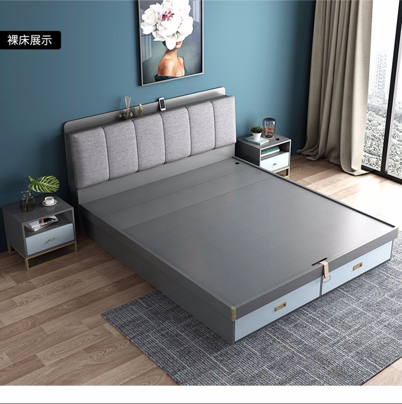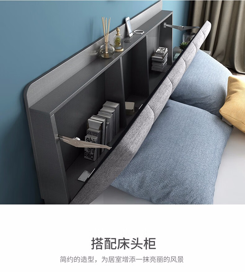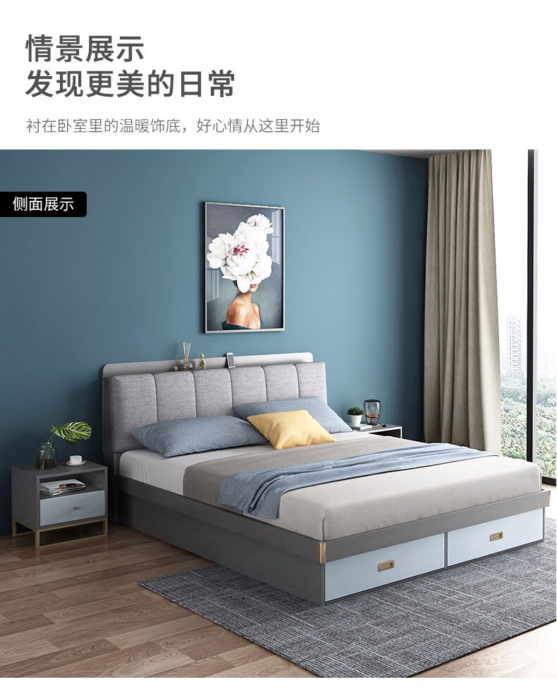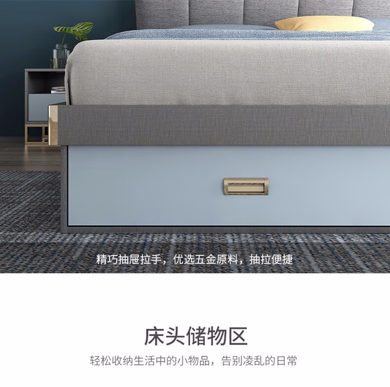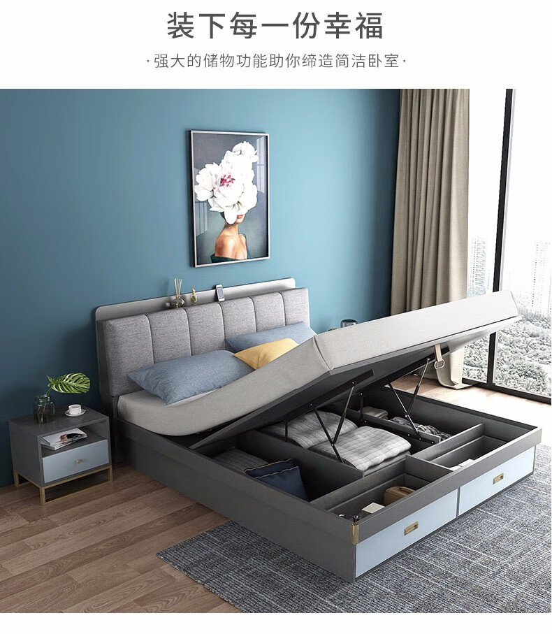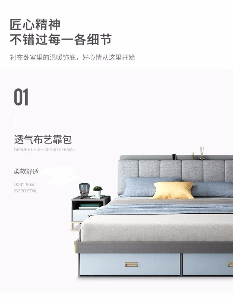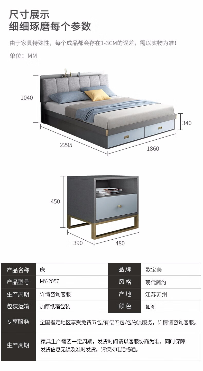 商品名称:欧宝美 北欧床简约现代双人床软靠高箱储物床 床+床头柜*1 1800*2000