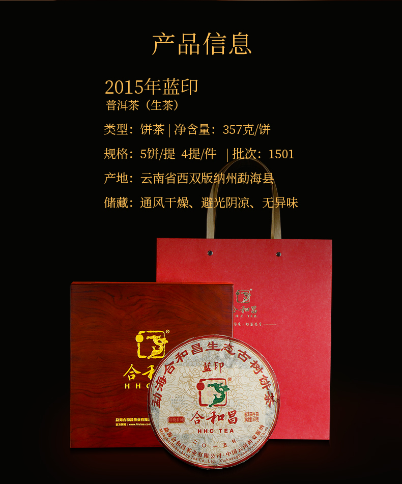 商品名称:【5年陈印级生茶】合和昌2015蓝印普洱茶357g饼茶 布朗山生态乔木