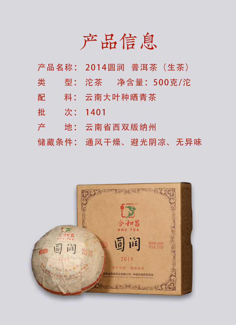 商品名称:合和昌2014年圆润 6年陈精品普洱茶生茶砖茶500g 勐海头春古树茶