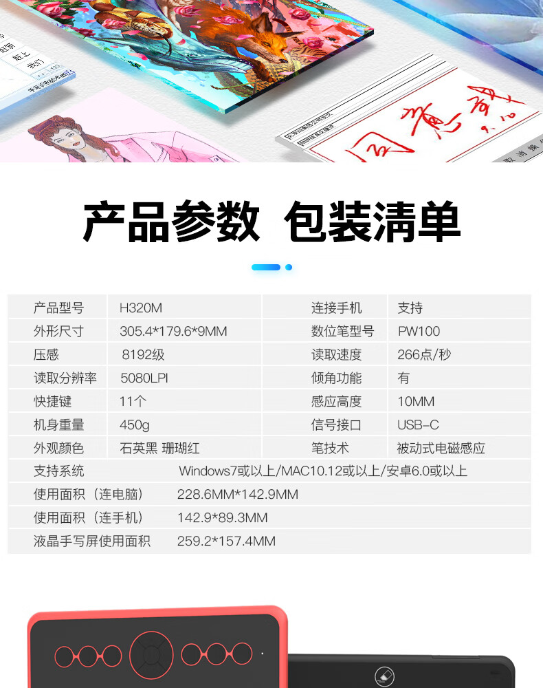 商品名称:绘王(HUION) H320M 数位板可连接手机绘图板写字手写板电脑绘画手绘板珊瑚红