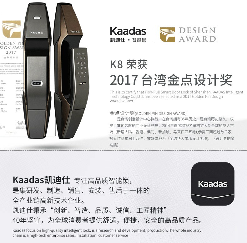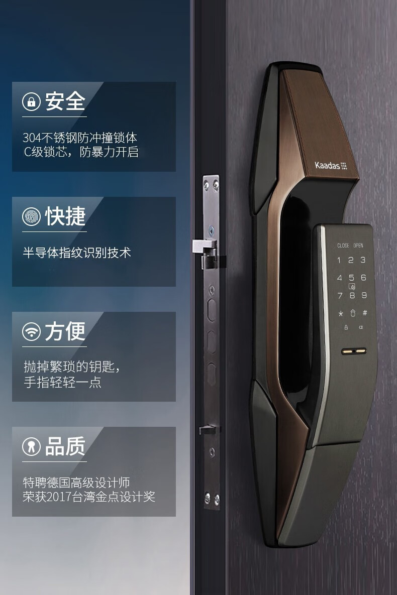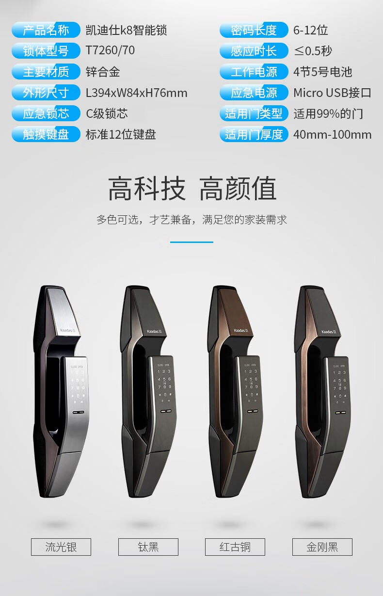 商品名称:凯迪仕(KAADAS) 指纹锁 密码锁智能锁防盗门锁 家用防盗门锁 电子锁密码锁智能门锁 金刚黑 K8