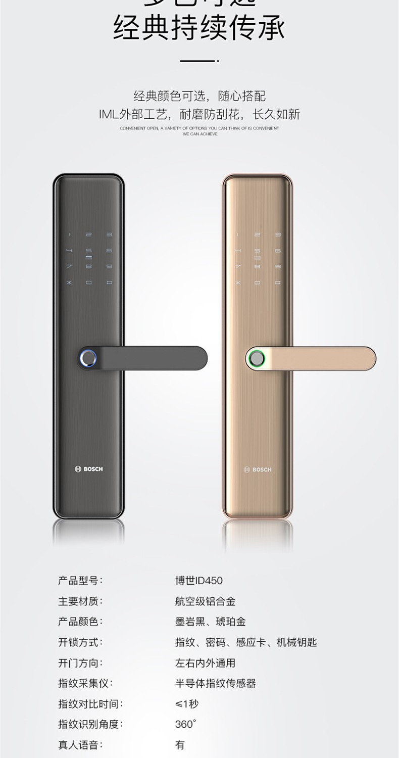 商品名称:博世/BOSCH 指纹锁 智能锁 智能门锁 C级锁芯 家用防盗门密码磁卡电子锁 ID450 琥铂金