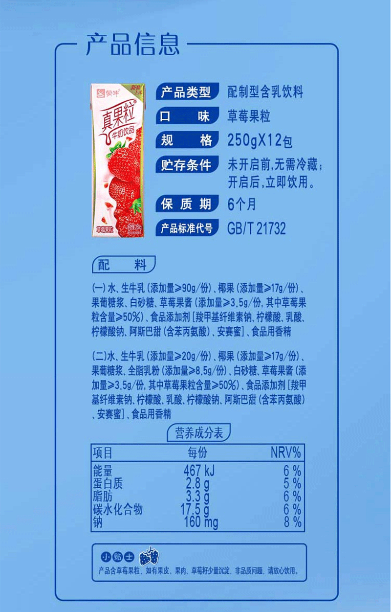 商品名称:蒙牛 真果粒 牛奶饮品(草莓)250g×12 盒装