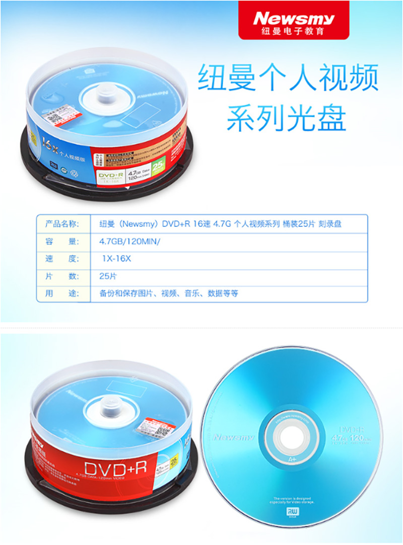 商品名称:☆纽曼 NEWSMY DVD+R 16速 4.7G 个人视频系列 桶装25片 刻录盘