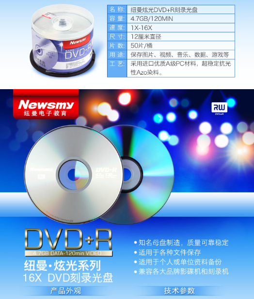 商品名称:纽曼 NEWSMY DVD+R光盘 刻录盘 炫光系列 16速4.7G 桶装50片