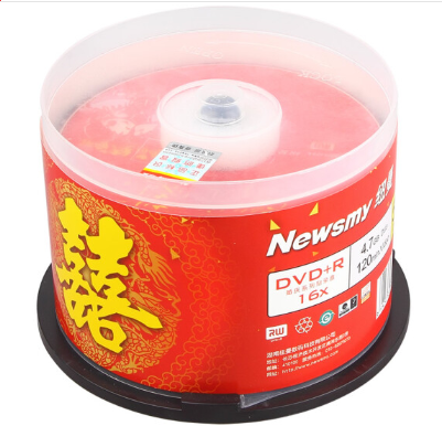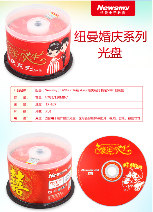 商品名称:纽曼 NEWSMY DVD+R 16速 4.7G 婚庆系列 桶装50片 刻录盘