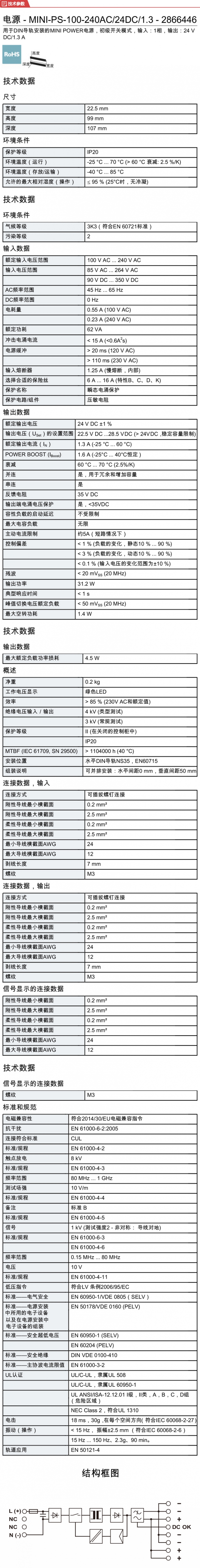商品名称:菲尼克斯 PHOENIX CONTACT 电源 MINI-PS-100-240AC/24DC/1.3