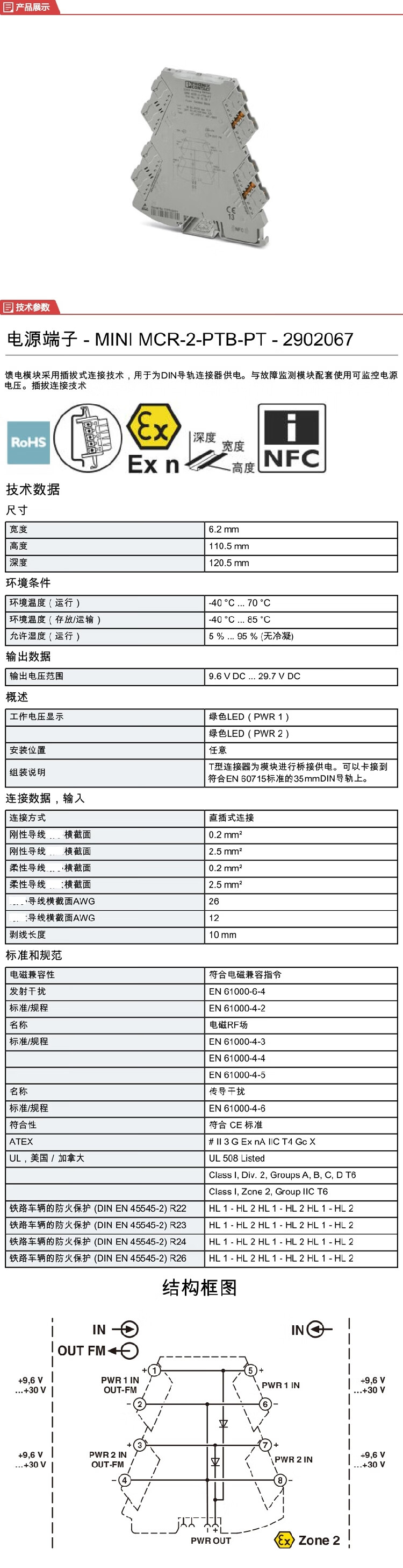 商品名称:菲尼克斯 PHOENIX CONTACT 电源端子 MINI MCR-2-PTB-PT