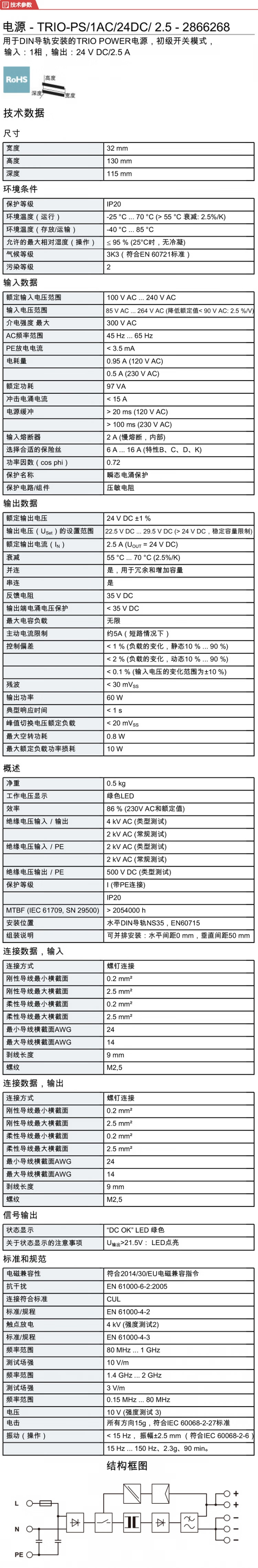 商品名称:菲尼克斯 PHOENIX CONTACT TRIO-PS/1AC/24DC/2.5 电源