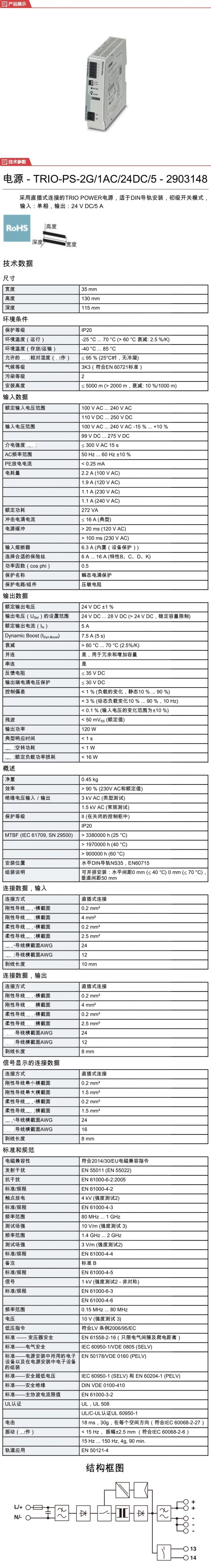商品名称:菲尼克斯 PHOENIX CONTACT TRIO POWER电源 TRIO-PS-2G/1AC/24DC/5