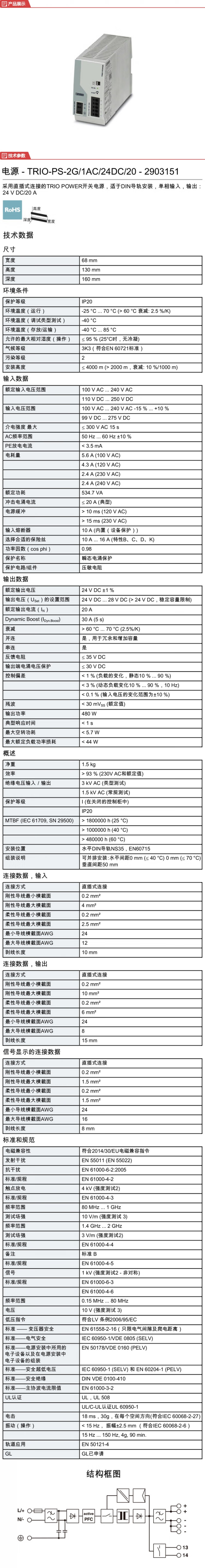 商品名称:菲尼克斯 PHOENIX CONTACT TRIO POWER开关电源 TRIO-PS-2G/1AC/24DC/20