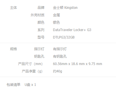 商品名称:金士顿 KINGSTON DTLPG3 32G USB3.0 硬件加密金属U盘 256位AES硬件加密