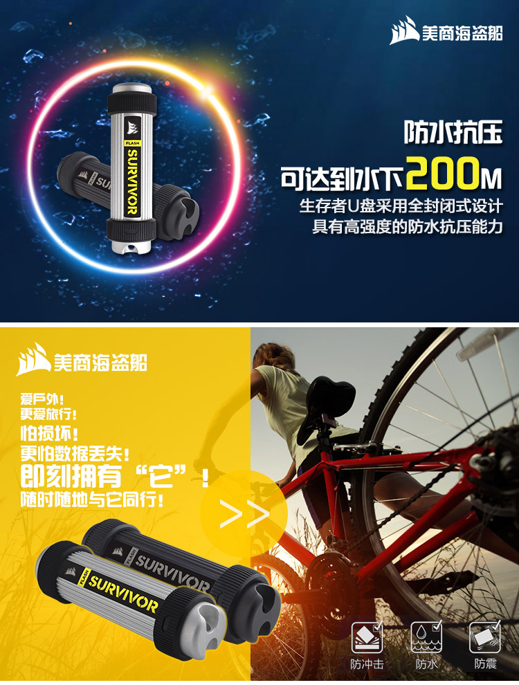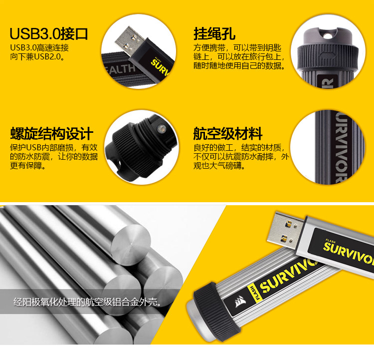 商品名称:海盗船 USCORSAIR 生存者 128GB USB3.0 高速U盘 铝镁合金航空材料 防水抗震 黑色