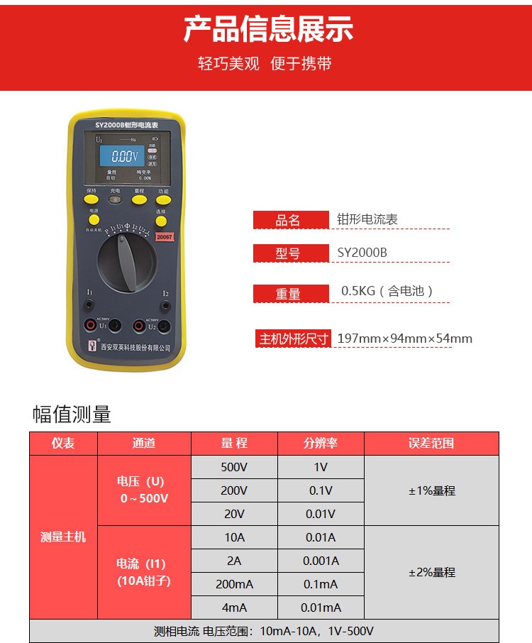 商品名称:双英 SY200B钳形电流表 双钳1.0级伏安相位显示高精度漏电流表