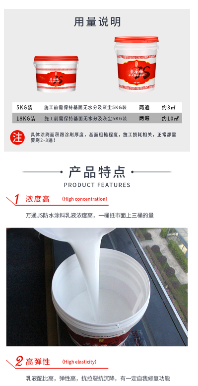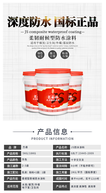 商品名称:万通 JS-5 聚合物水泥基防水涂料 高效型 超弹抗沉降型 5KG