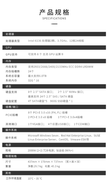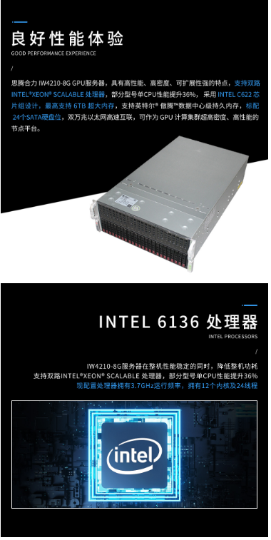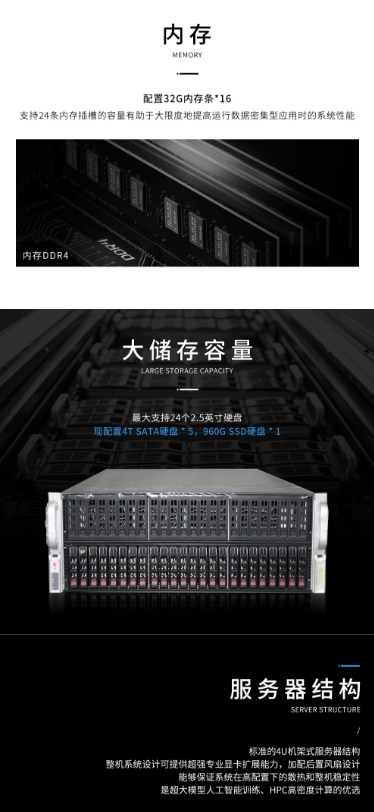 商品名称:思腾合力 SITONHOLY (2×6136/16×32GB/1×960G/5×4TB/2000W冗余/支持8GPU/机架式4U) GPU服务器