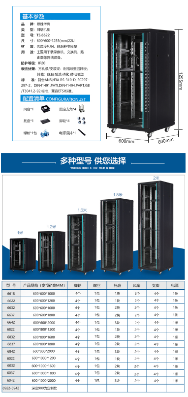 商品名称:慕胜华腾 TS.6622 22U网络机柜 19英寸 1.2米高