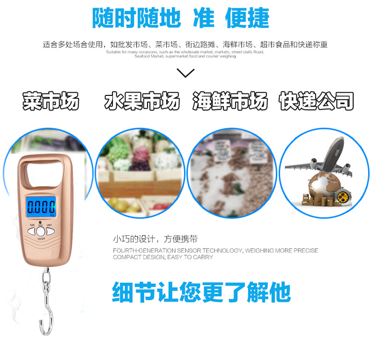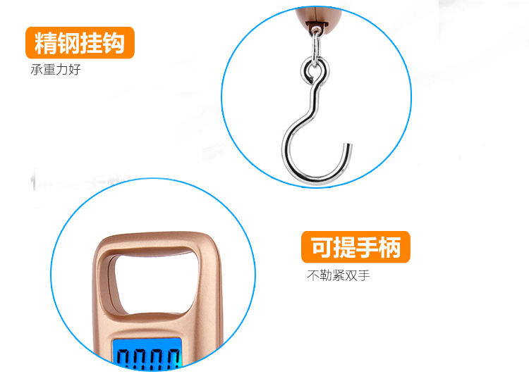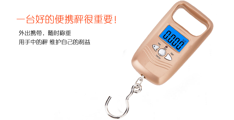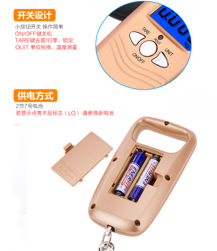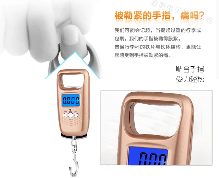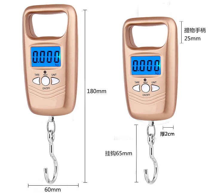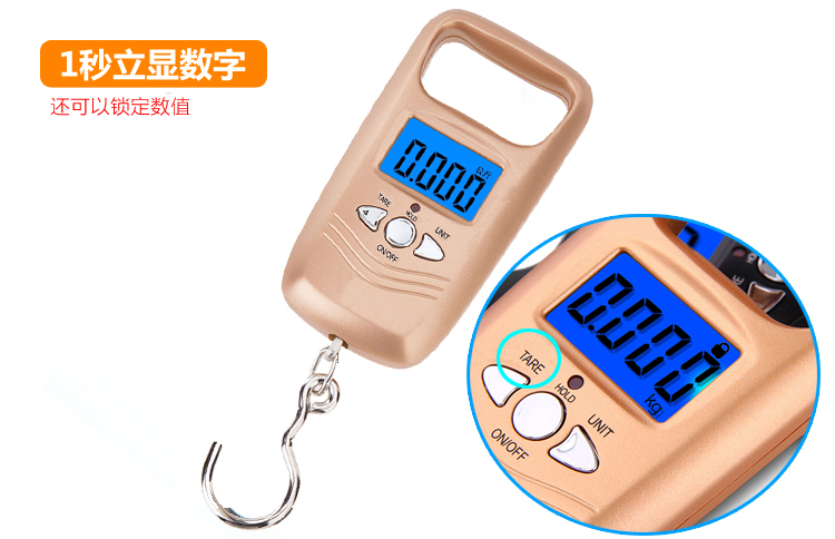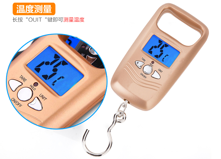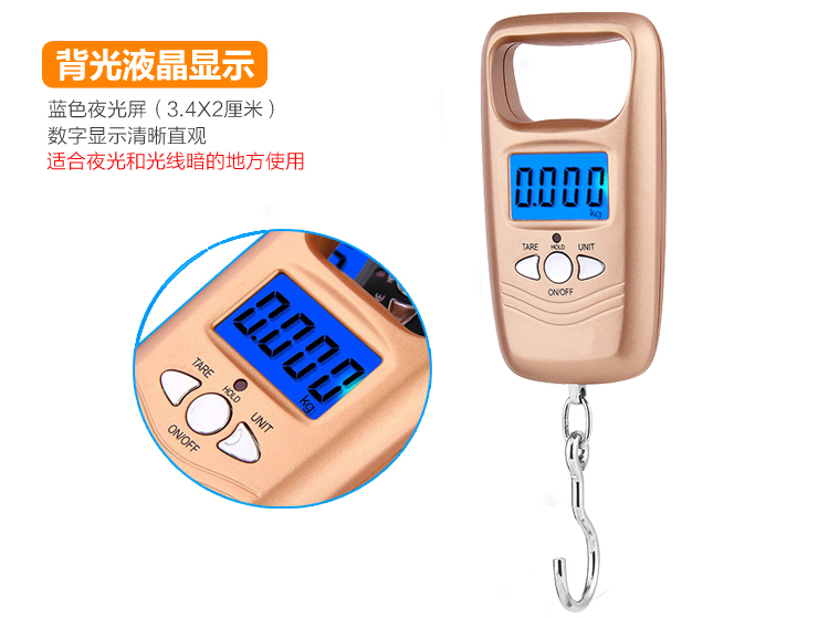 测量范围:5g~50kg精准度:当测量的范围是0~10kg时,误差±5g当测量的范围是10~50kg时,误差±10g屏幕:LCD液晶屏外壳:ABS工程塑料外壳颜色:香槟金特色:小巧方便携带;具有:去皮/4种单位转换/锁定承重刻数/温度测量/清零/低电压提示/超载提醒/夜视背光灯功能