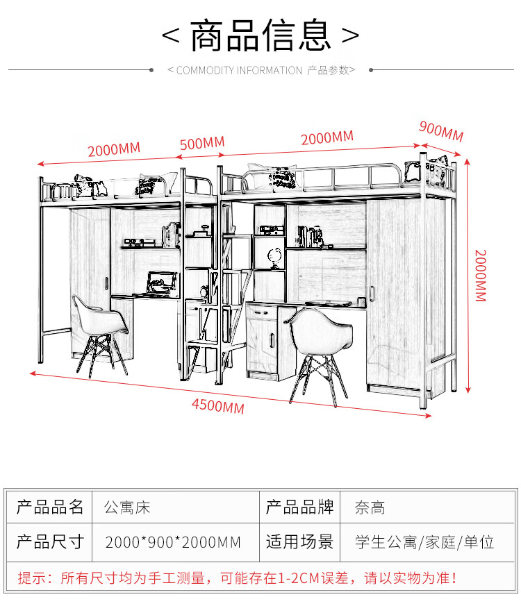 商品名称:奈高 双人组合床 4500×900×2000MM