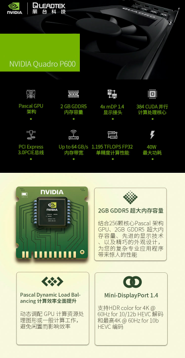 商品名称:丽台 LEADTEK QUADRO P600 2GB GDDR5/128BIT/64GBPS/CUDA核心384 PASCAL GPU架构/支持5K 绘图专业显卡