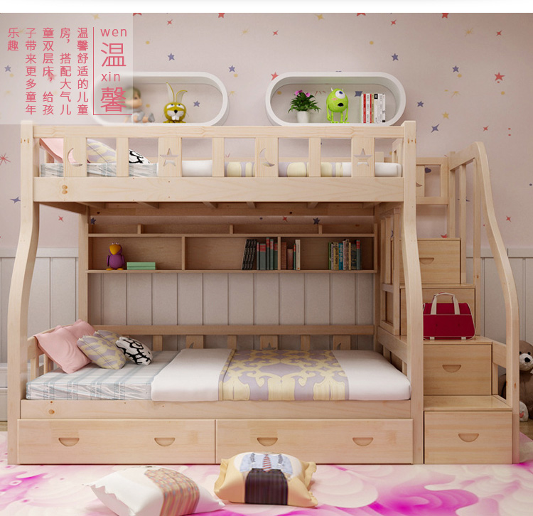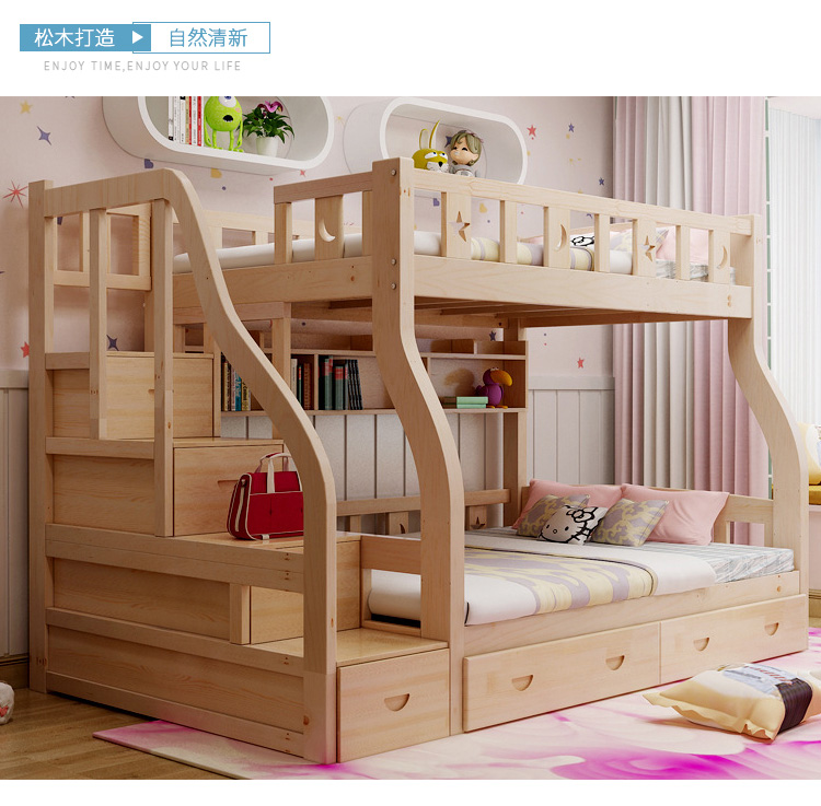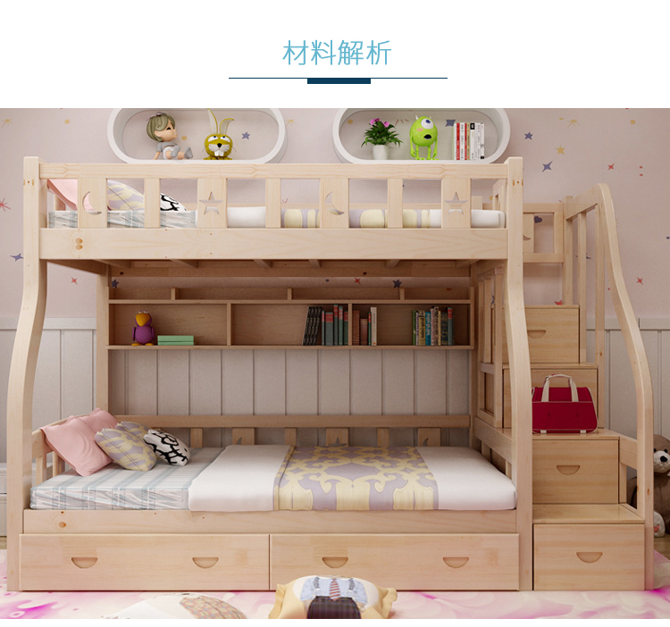 好事达 易美 074 定制松木上下床 小户型简约子母床 高低实木梯柜床1.2米 书架+床抽+梯柜