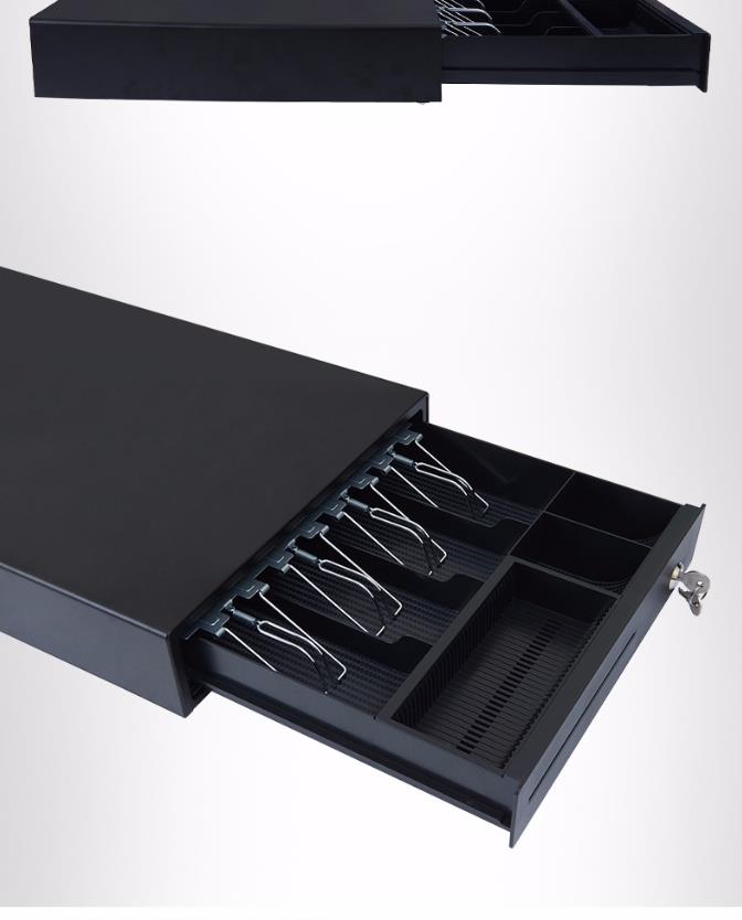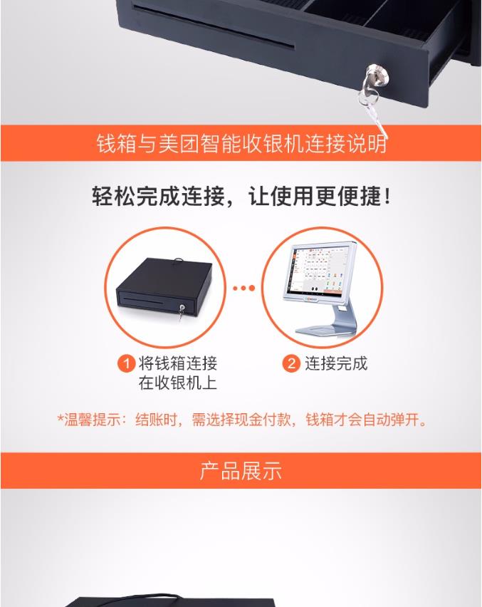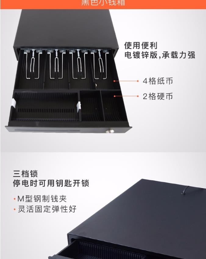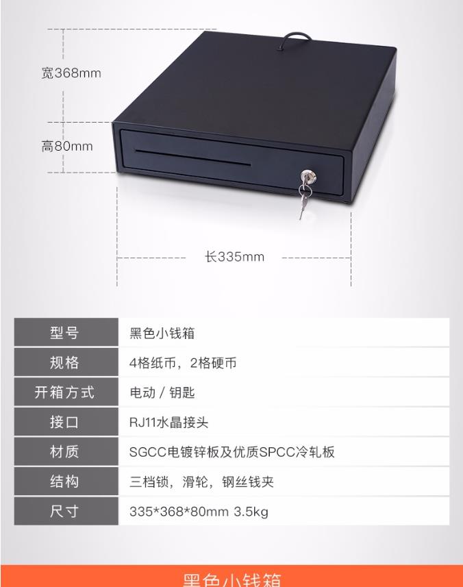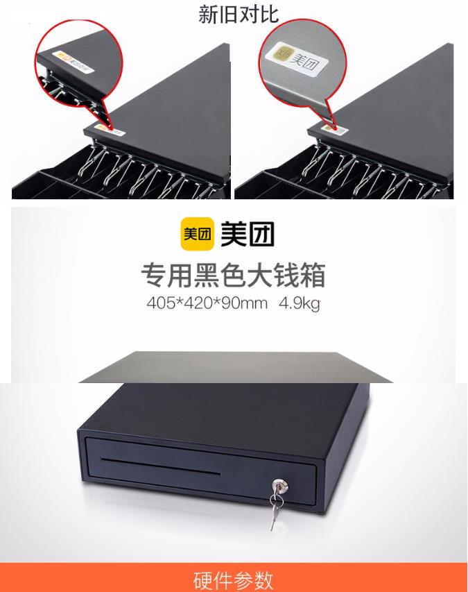 商品名称:美团点评 黑色小钱箱 4格纸币+2格硬币 3档锁 RJ11水晶接头 收银机 钱箱
