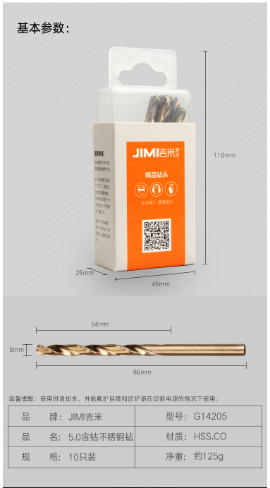 商品名称:吉米家居 JM-G14209含钴钻头手电钻冲击钻头金属不锈钢高速钢麻花钻电动工具配件9MM5支装