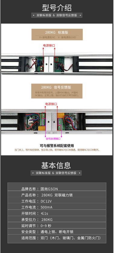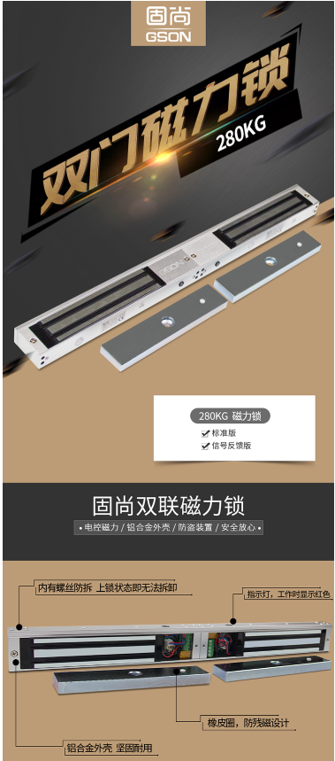 固尚 GSON GSON-S628DA 电磁锁 双开门 280公斤 12V 带门磁