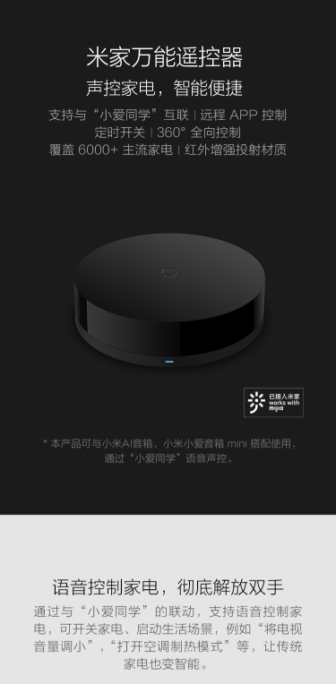 商品名称:米家 MIJIA 米家万能遥控器 支持与小爱同学互联语音控制