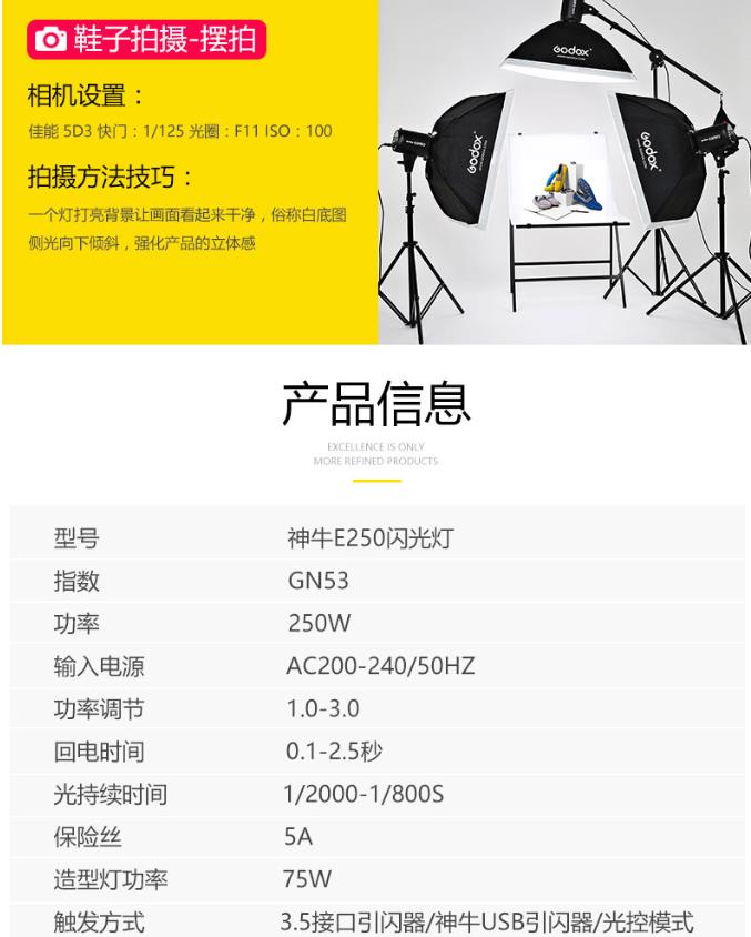 商品名称:神牛 GODOX E250 摄影棚小型摄影闪光灯套装 250W三灯套装 补光灯摄影柔光箱 三灯套装 小商品拍摄