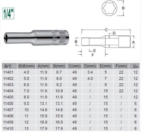商品名称:鹰之印 加长套筒子小飞套筒1/4"镜面小六角套筒头81408