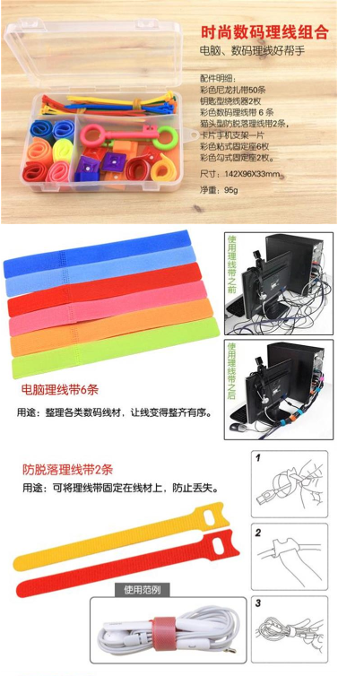 商品名称:现代 HYUNDAI HY-ZO2 数码理线组合 八件套(收纳盒×1、钥匙型绕线器×2、卡片手机支架×1、猫头型防脱落理线带×2、彩色数码理线带×6、彩色尼龙扎带×50、彩色粘式固定座×6、彩色勾式固定座×2)