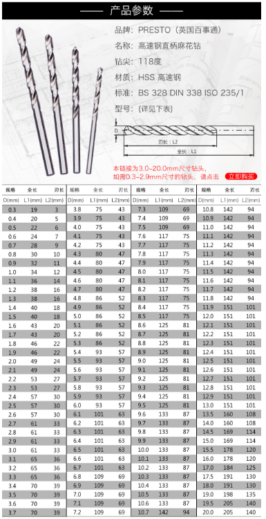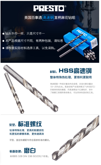 百事通 PRESTO 高速钢直柄麻花钻咀 直径:8.0MM 刃长:75.0MM 全长:117MM