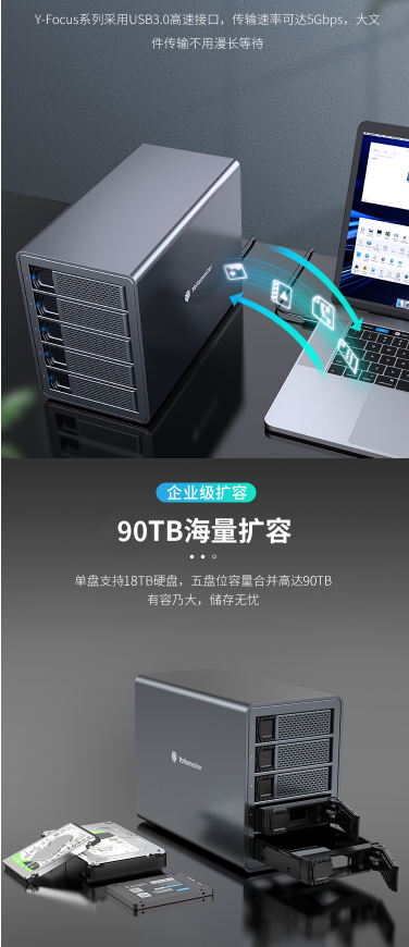 商品名称:YOTTAMASTER FS5RU3-GY 全铝五盘位 磁盘阵列硬盘柜 3.5英寸