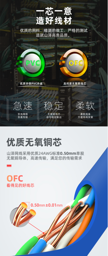 ☆山泽 SAMZHE 超六类细径CAT6A高纯无氧铜网络跳线 8芯双绞高速超6类RJ45网络线 0.5米黑色SZH-6005