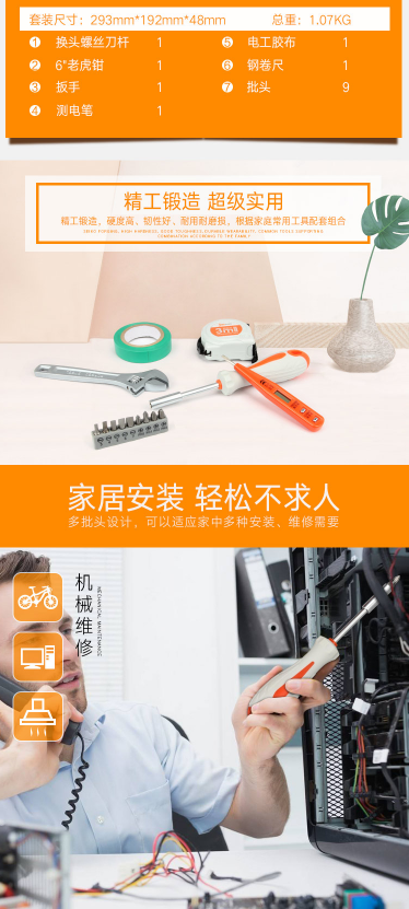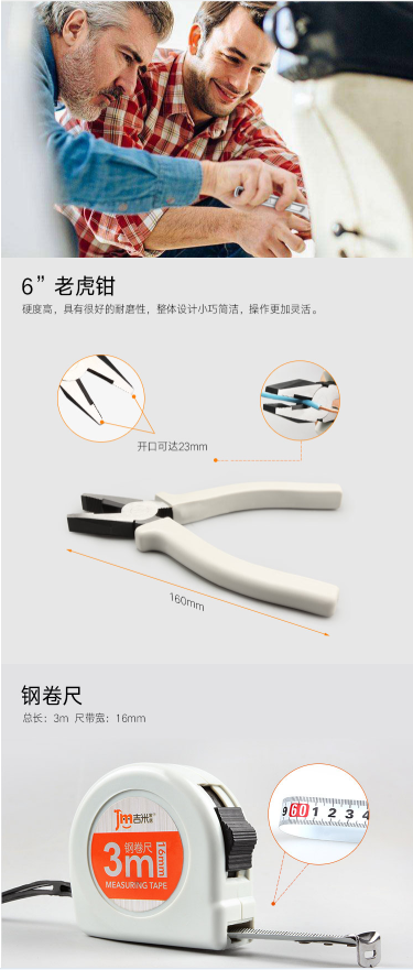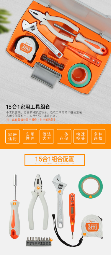 商品名称:吉米家居 JM-GMT15 15件家用工具套装 多功能螺丝批组套测电笔电工胶布钢卷尺老虎钳活动扳手电工紧固组套