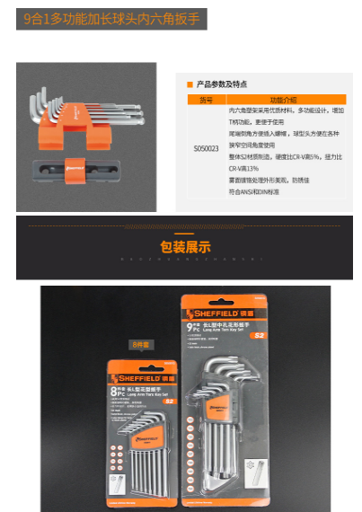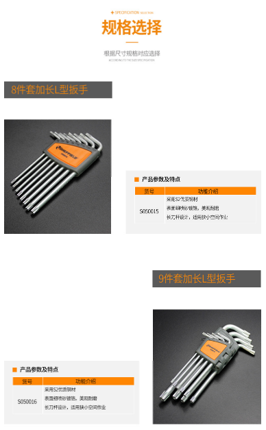 商品名称:钢盾 SHEFFIELD S050015 加长L型扳手 8件套 T6/T7/T8/T9/T10/T15/T20/T25