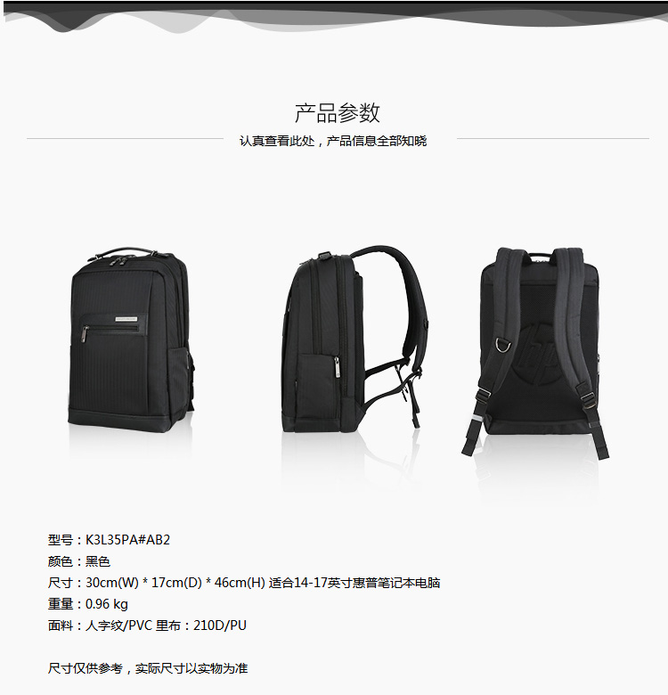 商品名称:惠普 HP K3L35PA 电脑包 17英寸 黑色