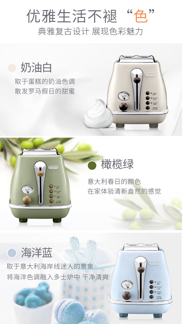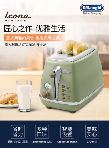 德龙 DELONGHI CTO2003(奶油白)多士炉 面包机 吐司机 烤面包机 家用 不锈钢 防尘盖
