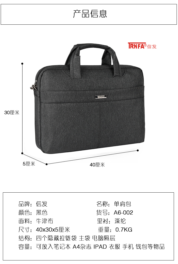 商品名称:信发 TRNFA A6-002 商务手提文件电脑包 400×50×300MM 黑色