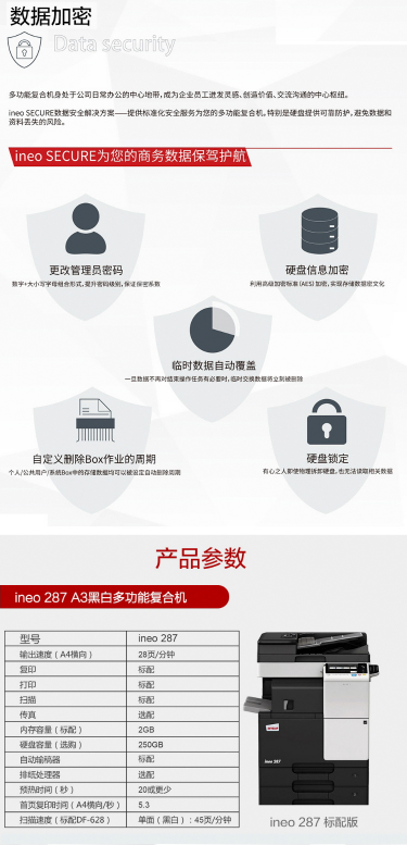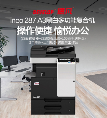 商品名称:德凡 DEVELOP INEO287 A3黑白多功能复合机标配(双面输稿器+双500页纸盒+100页手送托盘)(3年质保+上门服务)