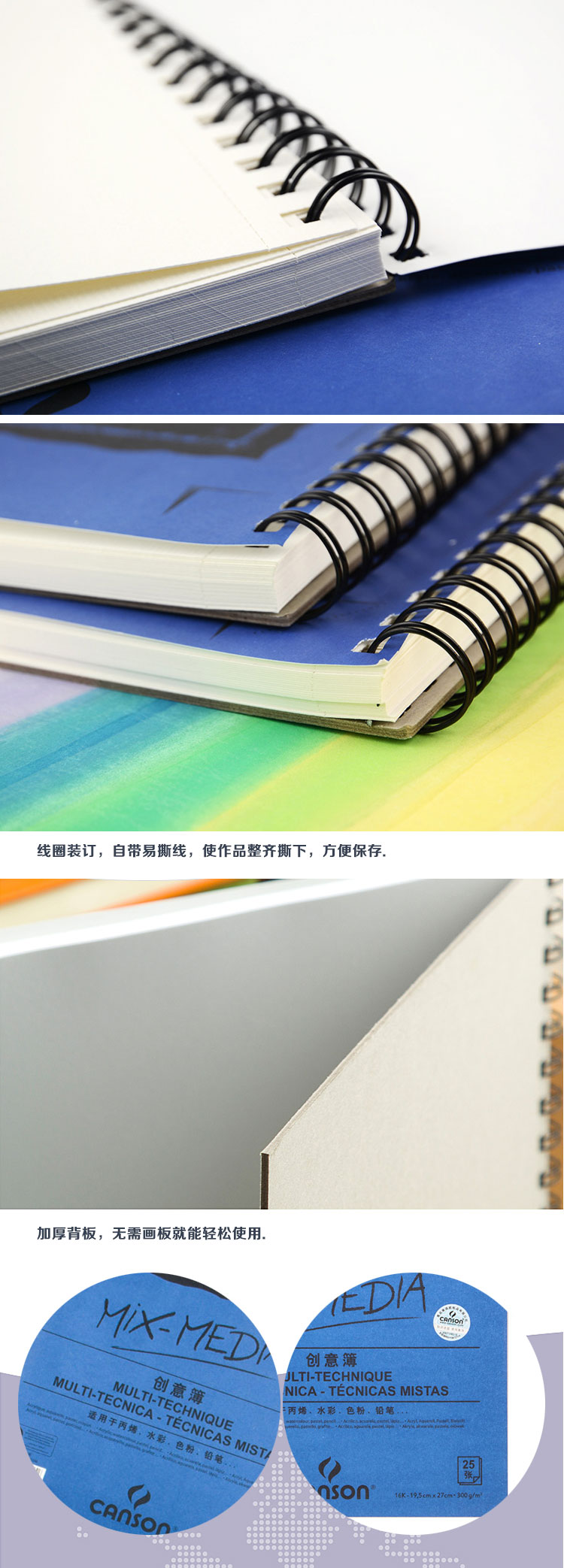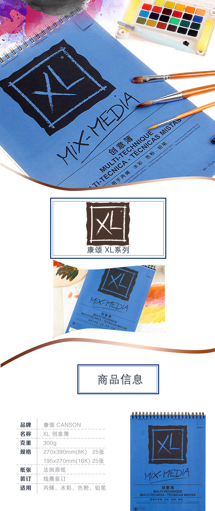 商品名称:康颂 CANSON XL系列创意簿丙烯纸水彩纸色粉纸铅笔素描线圈本300G8K(270*390MM)25张