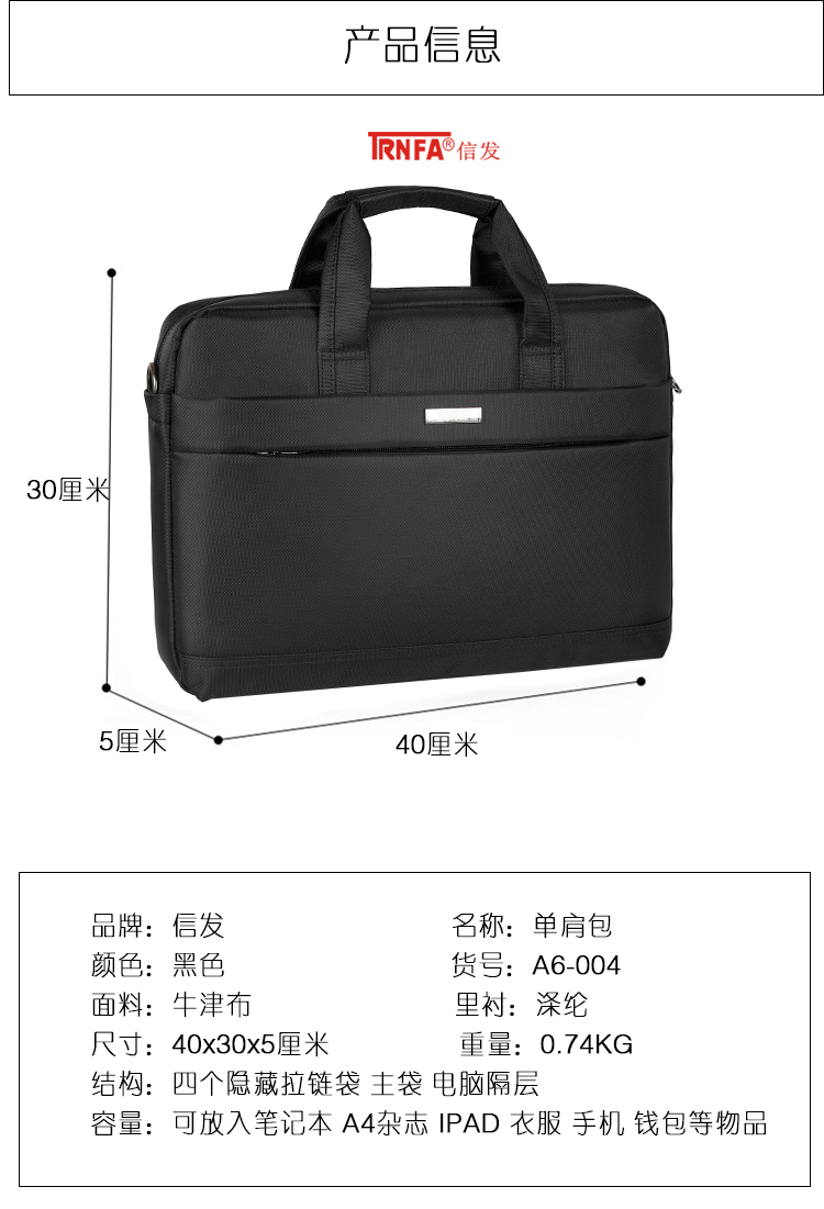 商品名称:信发 TRNFA A6-004 商务手提文件电脑包 400×50×300MM 黑色