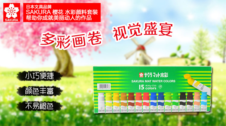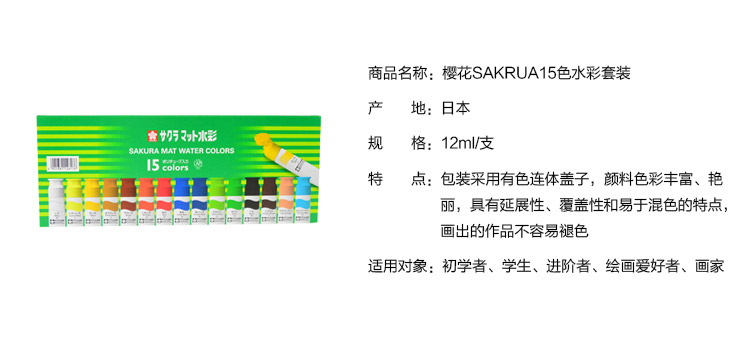商品名称:樱花 SAKURA 15色水彩颜料套装MW15PE12ML/支透明水彩颜料专业绘画绿盒【日本进口】