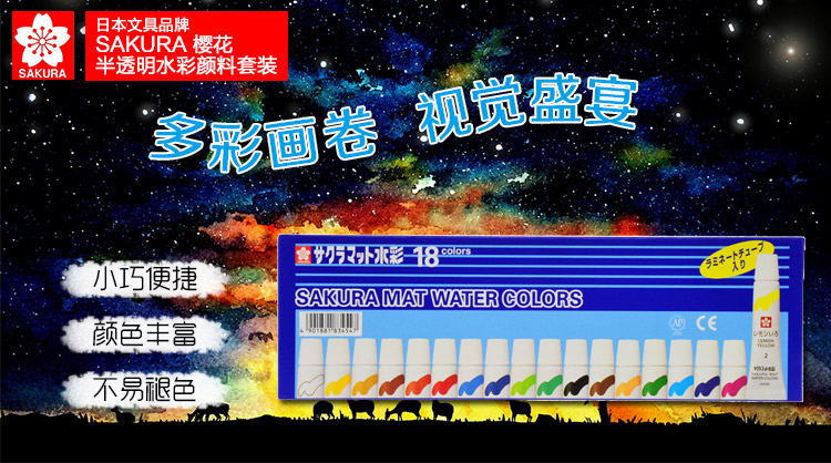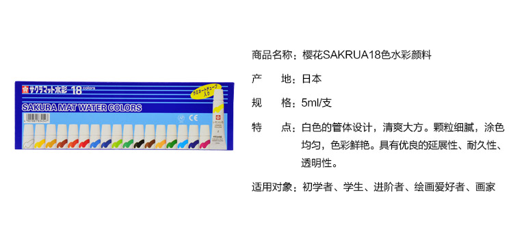 商品名称:樱花 SAKURA 18色水彩颜料套装EMW-185ML/支半透明水彩套装专业绘画蓝盒【日本进口】