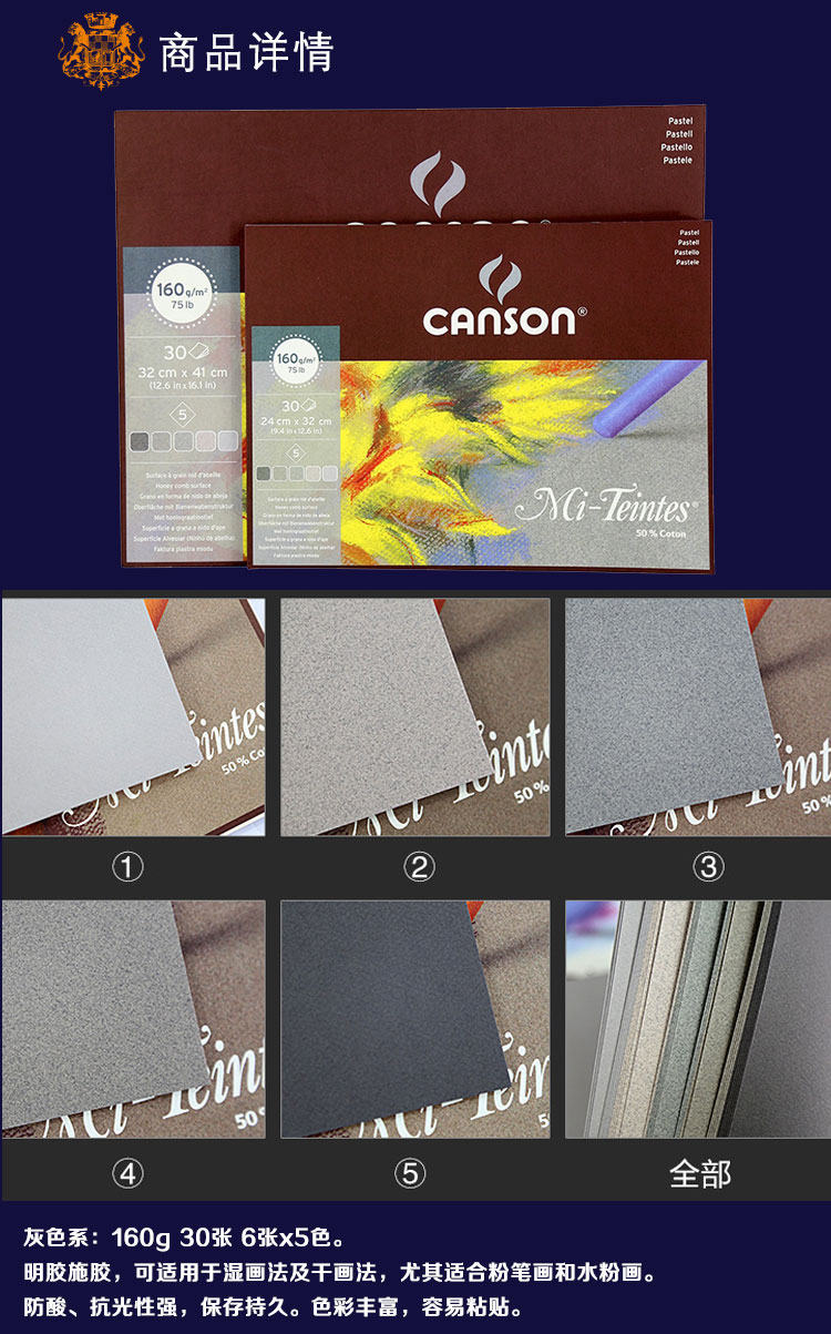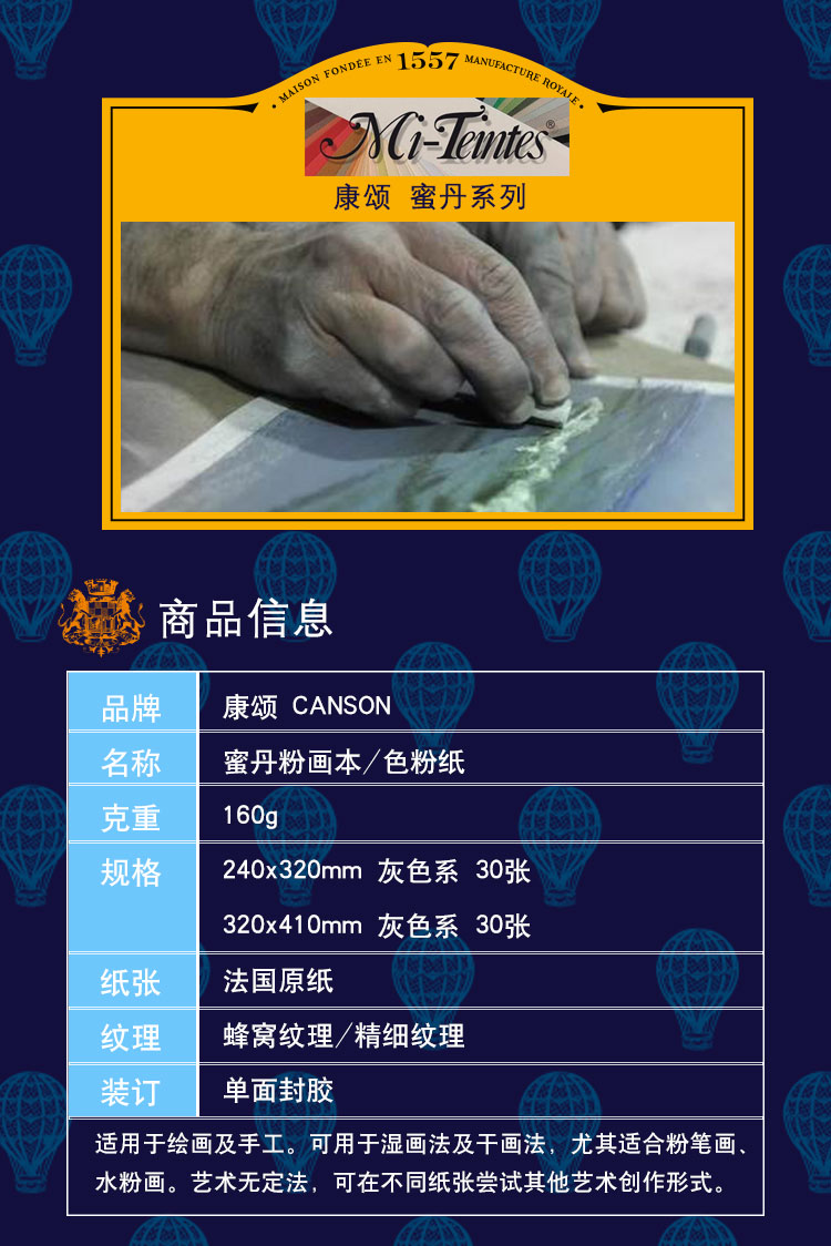 商品名称:康颂 CANSON 蜜丹粉画本色粉纸单面封胶灰色系30张/本160G320X410MM