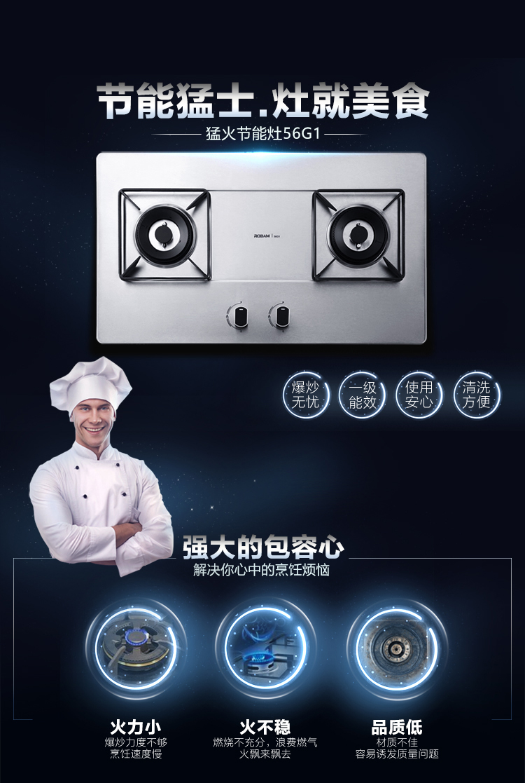 商品名称:老板 ROBAM 猛火节能 不锈钢燃气灶 液化气 JZ Y/T/R -56G1